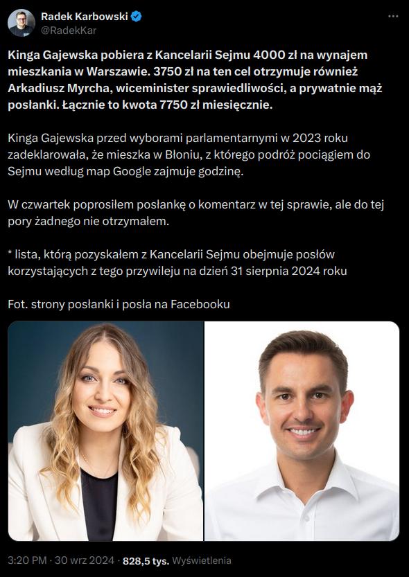 Państwo Myrcha i Gajewska od zwarcia małżeństwa (za 2018-2023r) pobrali łącznie 401 974 zl na ryczałtu samochodowego, co daje razem 350 km dziennie wspólnej jazdy wliczając weekendy i święta czyli około 5 godzin jazdy dziennie - głosi wpis na X.
