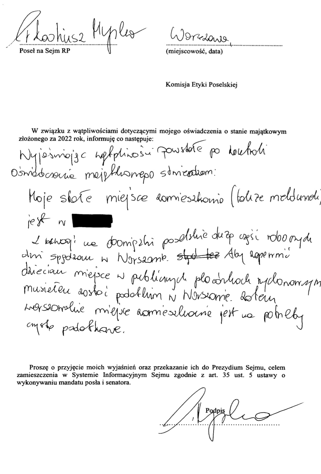 Jak można przeczytać na wyjaśnieniu Arkadiusza Myrchy, jednak… nie mieszkają w Warszawie, a tylko tak skłamali, żeby dzieci mogły iść do publicznego przedszkola w Warszawie, bo tak im wygodniej.